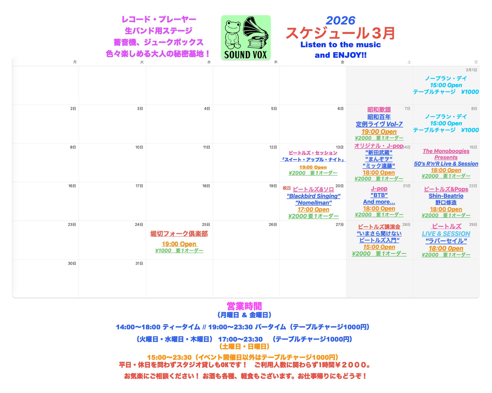 様々なバンドさんのライブ演奏や当店秘蔵のレコードを駆使した視聴会も開催。